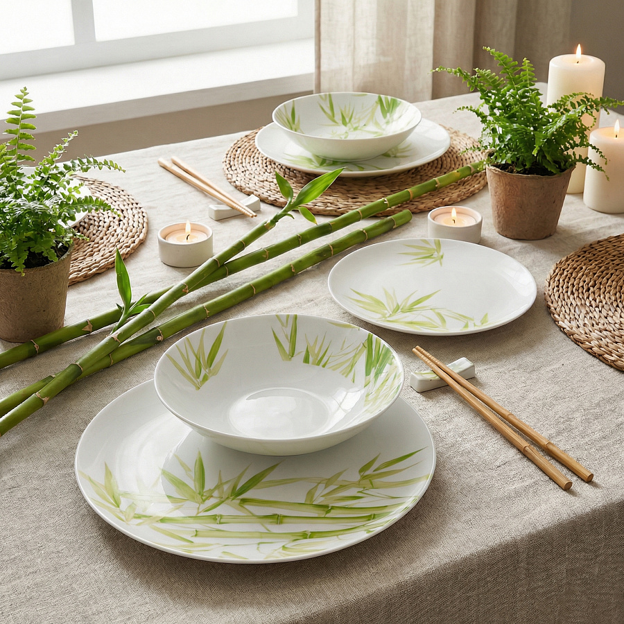 Свежий зелёный оттенок и тонкий растительный узор наполняют сервировку гармонией и природной лёгкостью. Подходит для супов, каш и рагу. Прочная, устойчива к сколам, безопасна для микроволновки и посудомоечной машины.
