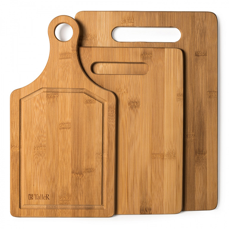 Разделочная доска изготовлена из бамбука: натурального, экологически чистого материала, прочного и долговечного. Имеет две рабочие поверхности, оснащена отверстием для подвешивания. В отличие от разделочных досок, изготовленных из мягких (пластик) или пористых (бук, береза) материалов, бамбуковые доски легко моются и не скапливают бактерии, не впитывают запахи, не изменяют вкусовые качества и цвет пищи, практически не впитывают влагу, при длительном использовании не рассыхаются, не расслаиваются и не деформируются. В отличие от разделочных досок, изготовленных из стекла или камня, бамбуковые доски не тупят ножи. Ручка позволяет легко переносить и хранить доски. Специальный желобок вдоль края разделочной доски не позволяет соку продуктов воде стекать с доски, обеспечивая аккуратность процесса. Рекомендуется мыть вручную. Размеры: большая доска - 35*25*1 см, средняя доска - 34,5*18*1 см, маленькая доска - 29*22*1 см