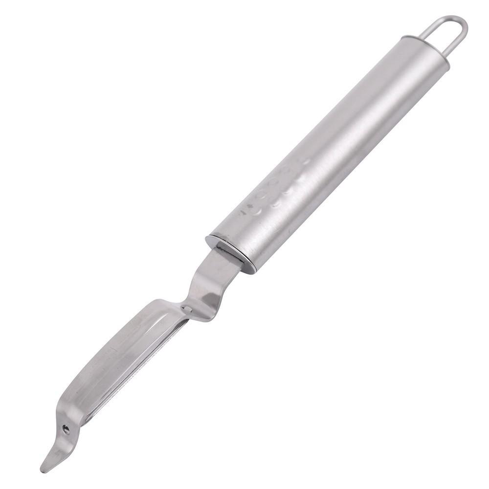 Удобная овощечистка «Лидер» с поворотным лезвием позволяет аккуратно удалять кожуру с овощей, фруктов, корнеплодов. Конструкция лезвия минимизирует отходы во время чистки, позволяет регулировать толщину среза. Заостренная часть предназначена для вырезания глазков и трещин. Овощечистку можно использовать для нарезки сыра, авокадо и шоколадной стружки. Изготовлена из коррозионностойкой (нержавеющей) стали. После применения рекомендуется мыть мягкой щеткой с использованием жидких моющих средств. Длина: 8,5 см Ширина: 1,5 см Высота: 26 см