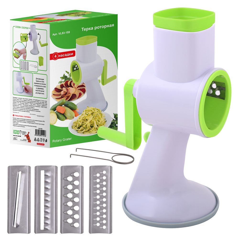 Многофункциональная терка роторная - мультирезка поможет вручную измельчить продукты до нужного состояния. В комплекте 4 типа насадок: