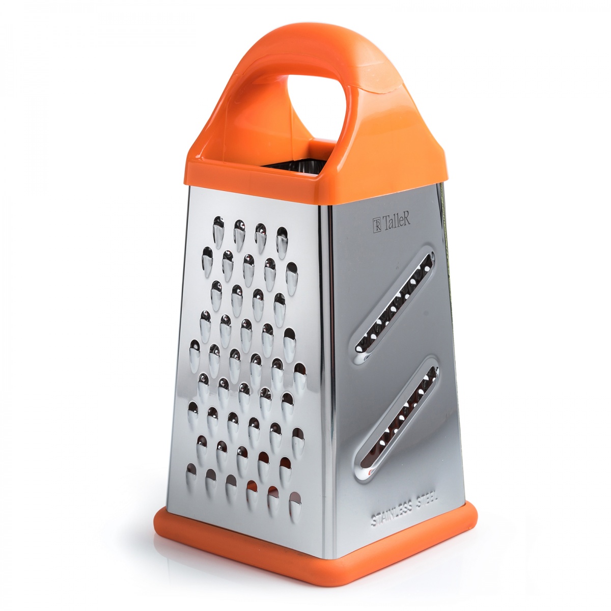 Терка 4 в 1, размеры 10,3*10,3*20,3. Ручка удобной формы не выскальзывает из рук даже при намокании. Нескользящий силиконовый протектор на основании предотвращает скольжение во время использования и защищает поверхность от повреждений.