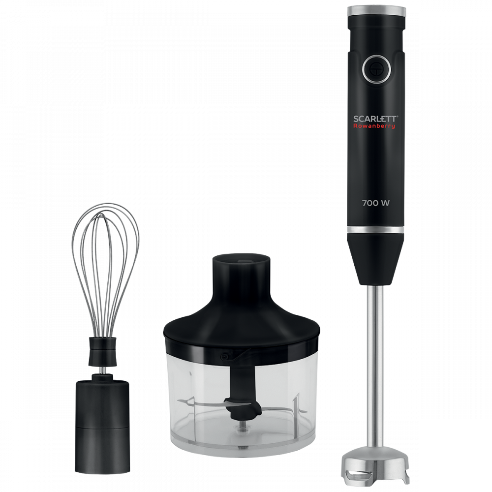 Погружной блендер Scarlett SC-HB42F66 оснащён мощным мотором 700 Вт, к нему прилагается мини-измельчитель и венчик, с помощью которых можно измельчать продукты, готовить тесто, взбивать крем, выполнять другие задачи.