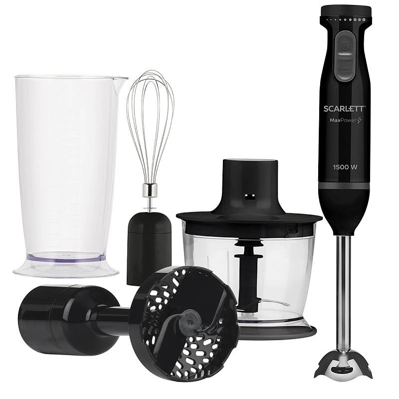 Аксессуары в комплекте: насадка для картофельного пюре, венчик, измельчитель, мерный стакан
