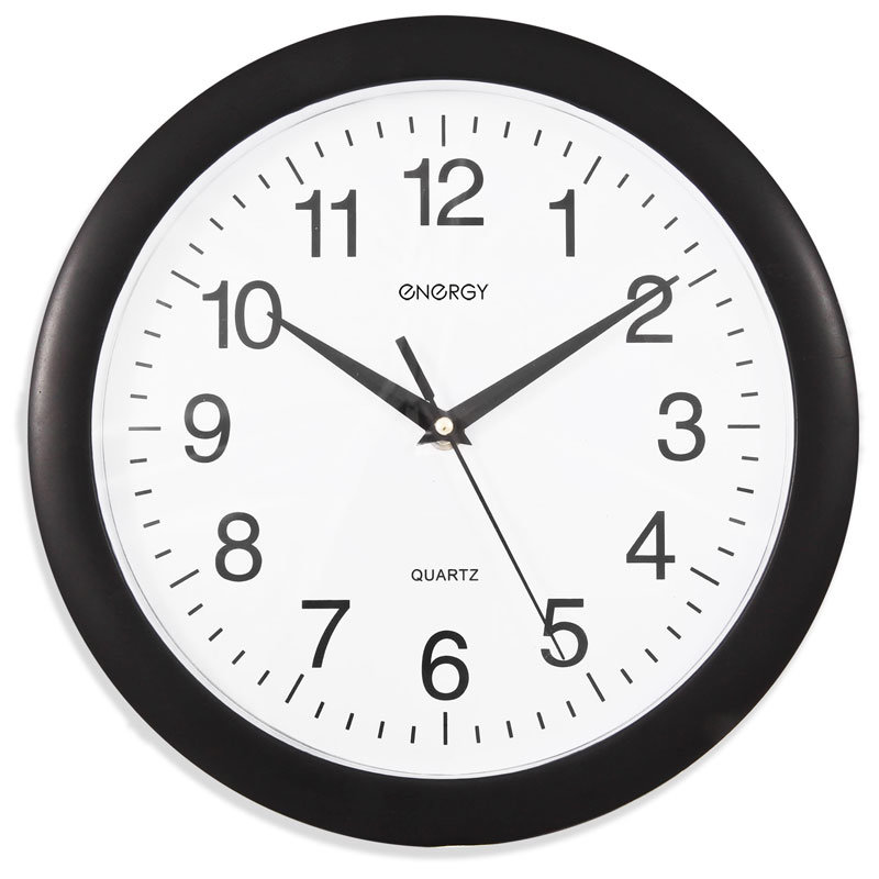 Часы круглые настенные 27.5 см ENERGY ЕС-02 плавный ход Черные с белым Часы в строгом дизайне круглой формы. Механизм часов бесшумный, что не отвлекает на работе и во время отдыха. Четкие цифры черного цвета позволят легко одним взглядом определить время до конца рабочего дня или к обеду. Питание от 1 пальчиковой батарейки типа АА (в комплект не входят) Напряжение: 1 х АА 1.5В Размер 27,5*3,8 см Плавный ход секундной стрелки Кварцевый механизм Стекло органическое пластиковое Обод черный Секундная стрелка Циферблат с 12 четкими цифрами
