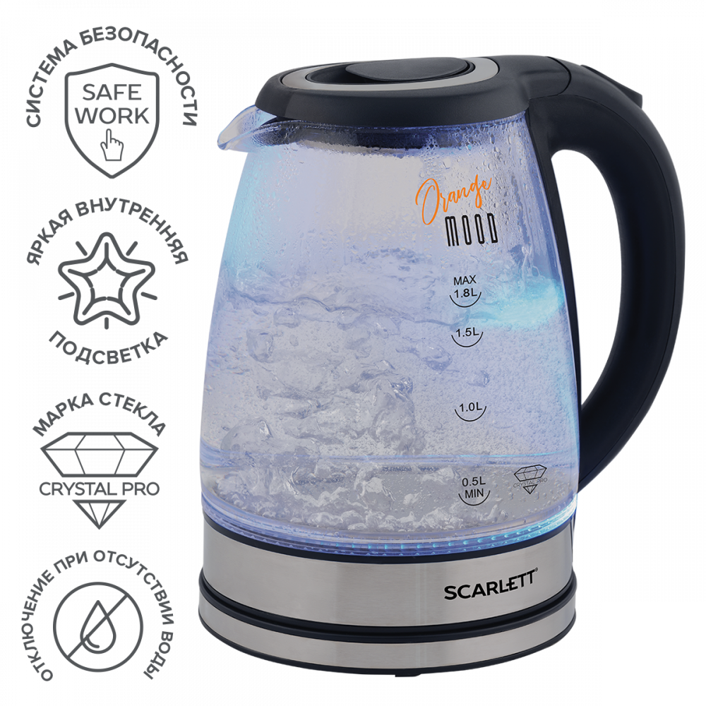 Эргономичная ручка, закрытый нагревательный элемент сделают эксплуатацию прибора еще проще и комфортнее. Внутренняя подсветка позволит наблюдать за завораживающим процессом кипячения.