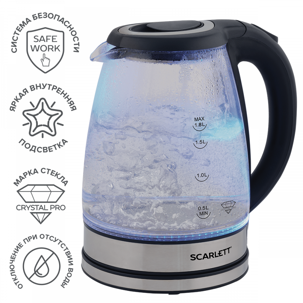 Эргономичная ручка, закрытый нагревательный элемент сделают эксплуатацию прибора еще проще и комфортнее. Внутренняя подсветка позволит наблюдать за завораживающим процессом кипячения.