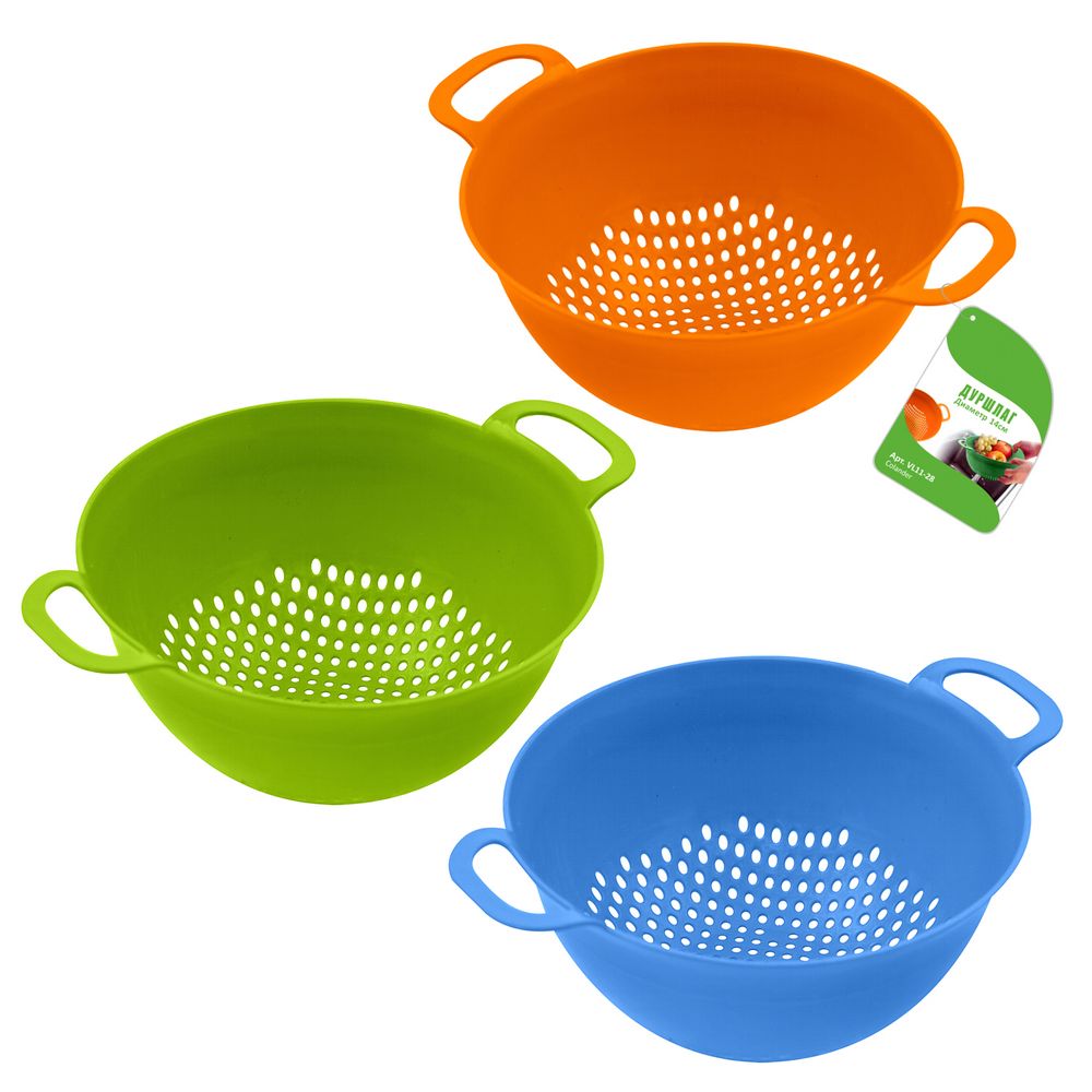 Дуршлаг — идеальное приспособление для мытья ягод, фруктов, салата и овощей, их сушки и даже временного хранения. С помощью дуршлага можно сливать лишнюю воду с тушеных овощей, отваренного картофеля, риса или макарон. Изделие имеет классическую форму, оснащен ручками для удобства использования. Изготовлено из пластмассы (полипропилен). 3 цвета