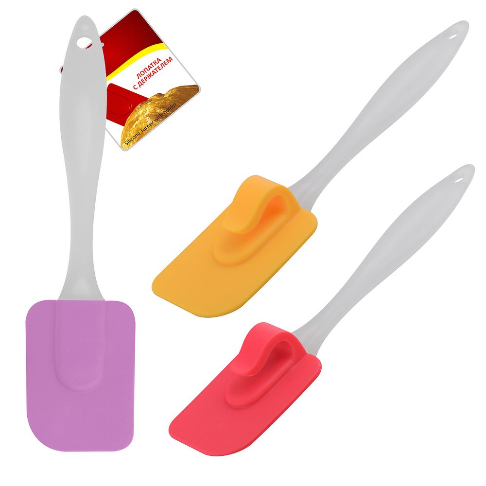 Лопатка с держателем Лопатка с держателем – функциональное приспособление, которое используется для переворачивания блюд, смазывания выпечки, для перекладывания кондитерских изделий, для подачи пирожных тортов и сервировки других продуктов. Лопатка производится из 100% силикона, этот материал полностью гигиеничен, прочен и рассчитан на высокие температуры до 210°С. Рабочая часть изготовлена из силикона, а ручка из пластмассы. Общая длина изделия 19 см. Преимущества силиконовой лопатки в том, что она не царапает поверхности, не выделяет вредных веществ, гигиеничная и не портится под воздействием высоких температур. Специальный крючок сделан для того, чтобы крепить инструмент на край посуды в процессе приготовления пищи, таким образом стол остается чистым. Приспособление моется губкой с жидкими моющими средствами без использования абразивных материалов и металлических губок. Со временем может исчезать яркость света, что не влияет на качество изделия. Длина: 4,5 см Ширина: 2,5 см Высота: 18,5 см