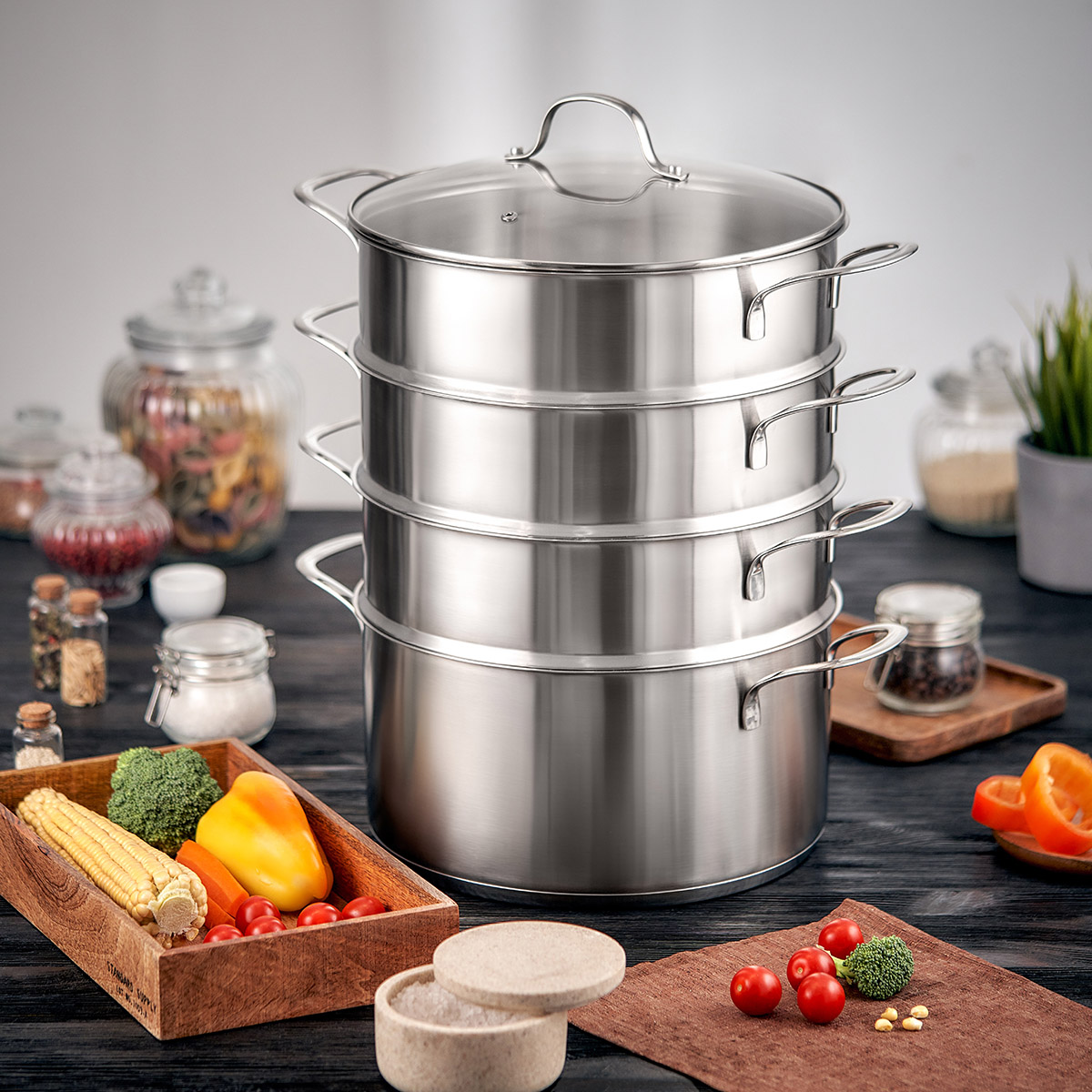 Состав: кастрюля с крышкой 28 х 15 см (объём 8,9 л), 3 уровня 28 х 10 см.