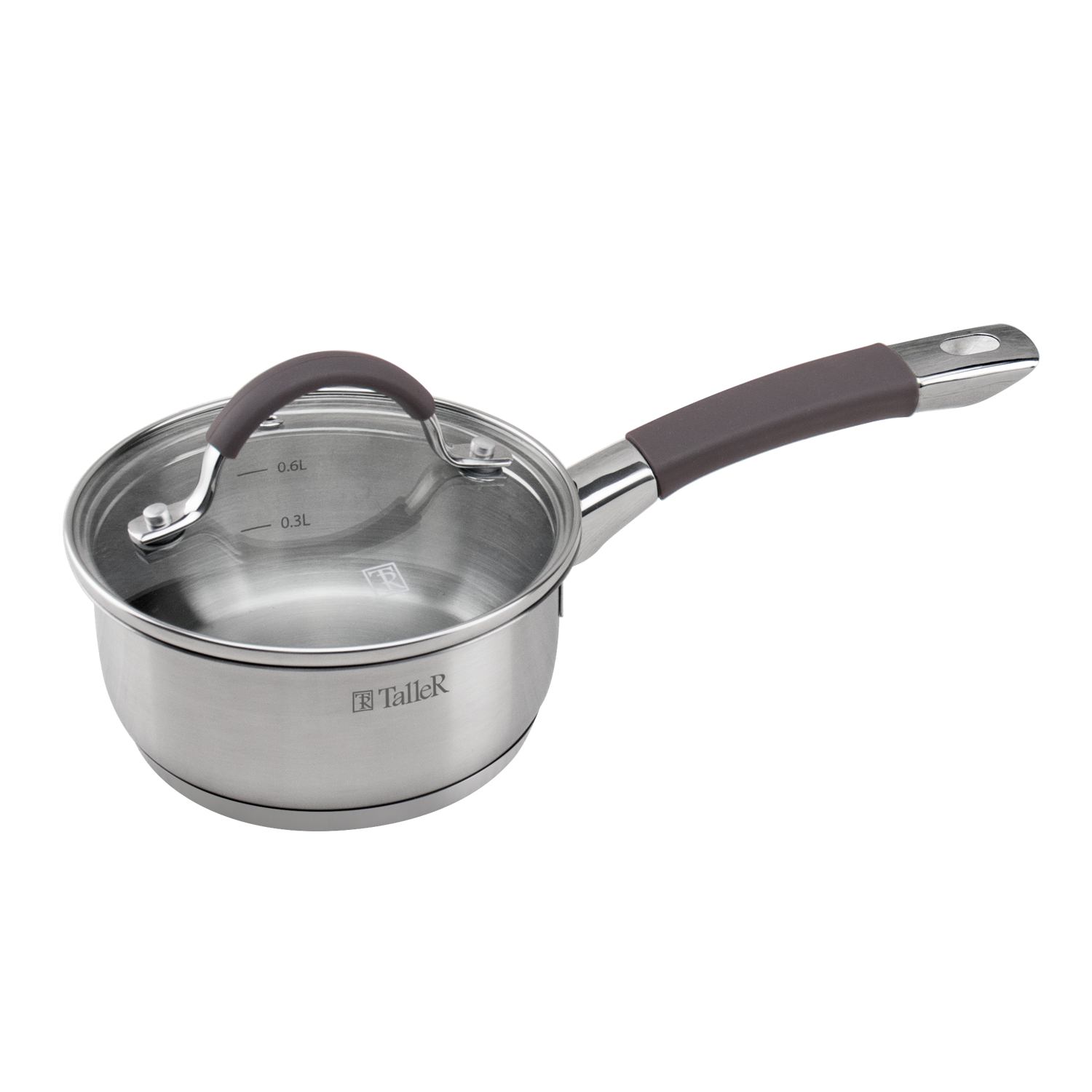 Полировка внешняя - матовая, внутренняя - матовая. Есть отметки литража. Крышка из жаропрочного стекла со стальным ободом и отверстием для выхода пара. Ручка из нержавеющей стали с силиконовой вставкой даже при намокании не выскальзывает из рук. Цвет силиконовых вставок на ручках - коричневый. Небольшой ковш объемом меньше литра идеален для приготовления каши ребенку, соуса, яиц, а также для подогревания молока.