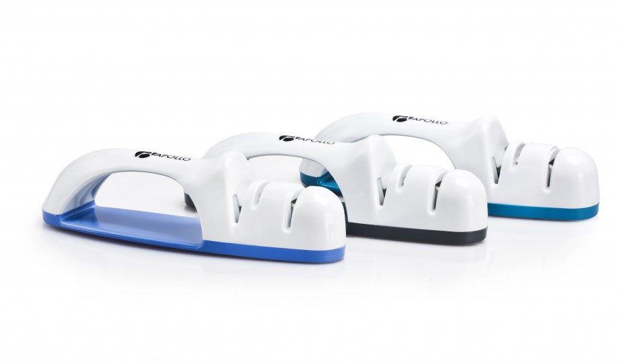 Точилка для кухонных ножей изготовлена из пластика. Точильный элемент изготовлен из абразивного камня.