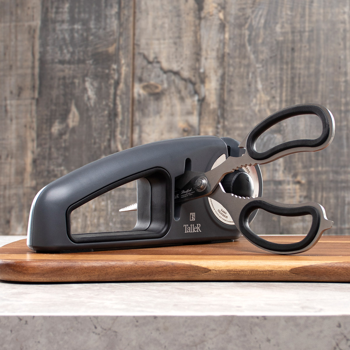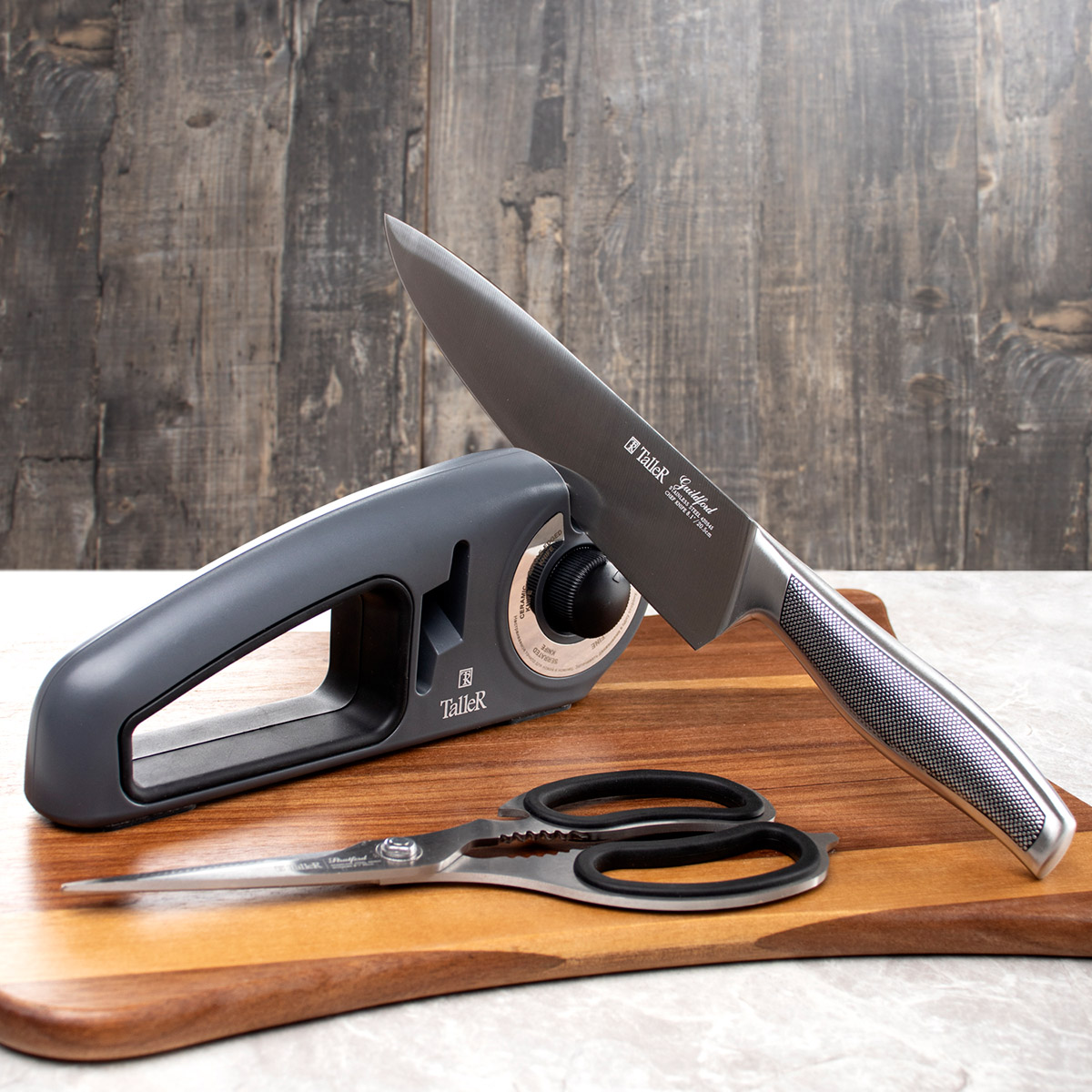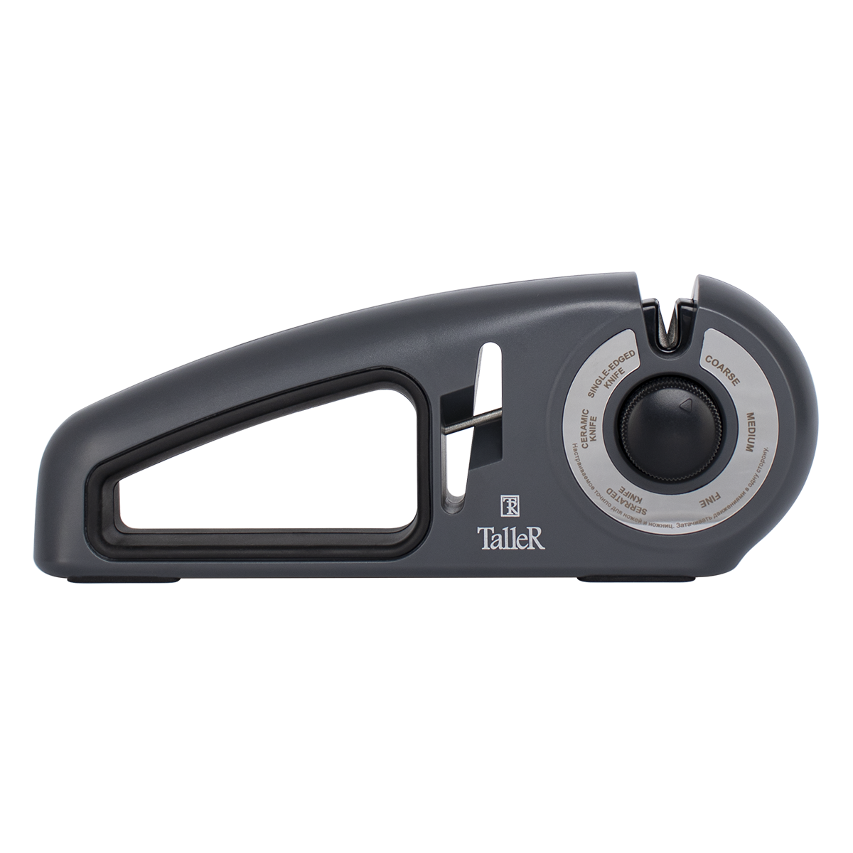 Подходит для всех кухонных ножей и для заточки ножниц. Сменяемые элементы для заточки различных типов ножей включая ножи с односторонней заточкой и ножи для нарезки хлеба. Корпус выполнен из пищевого пластика. Удобный переключатель модулей. Силиконовые противоскользящие протекторы. Комфортная ручка.