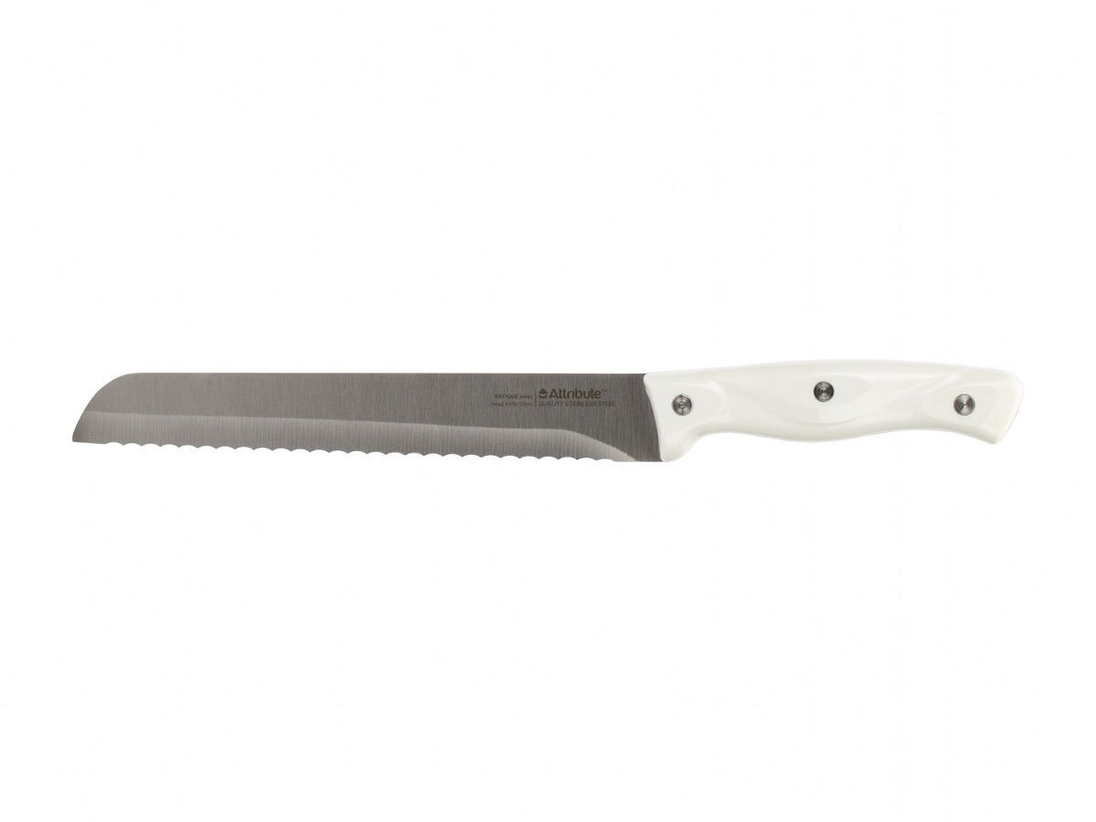 Нож для хлеба ANTIQUE бренда ATTRIBUTE имеет особую форму для нарезки свежих хлебобулочных изделий с хрустящей корочкой. Благодаря зазубренному острому лезвию нож легко нарезает хлеб на аккуратные тонкие ломтики. Лезвие изготовлено из экологически чистой высококачественной нержавеющей стали. Особая заточка ножа позволяет лезвию оставаться острым долгое время. Удобная ручка из прочного пластика зафиксирована дополнительными болтами.