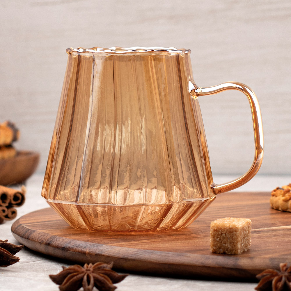 Цвет - янтарный. Внешняя поверхность - гладкая, внутренняя - ребристая. Вес кружки - 123 г.