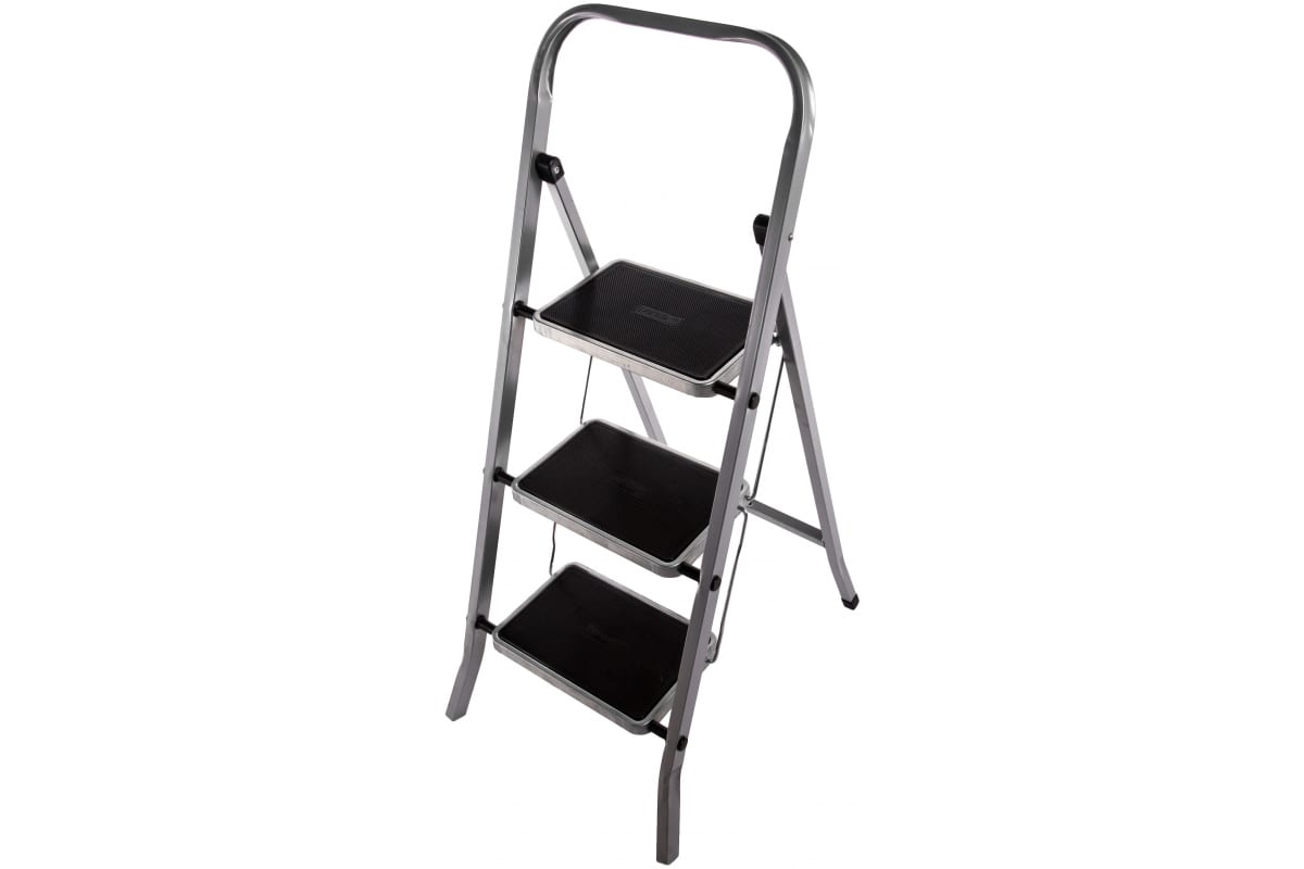 Стремянка изготовлена из стали. Используется в быту, на производстве и строительных площадках.