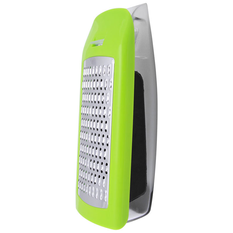 Терка с поддоном и крышкой Состав: нержавеющая сталь, пластик Размер: 16,5*8*5 см Корпус терки - ярко зеленого цвета
