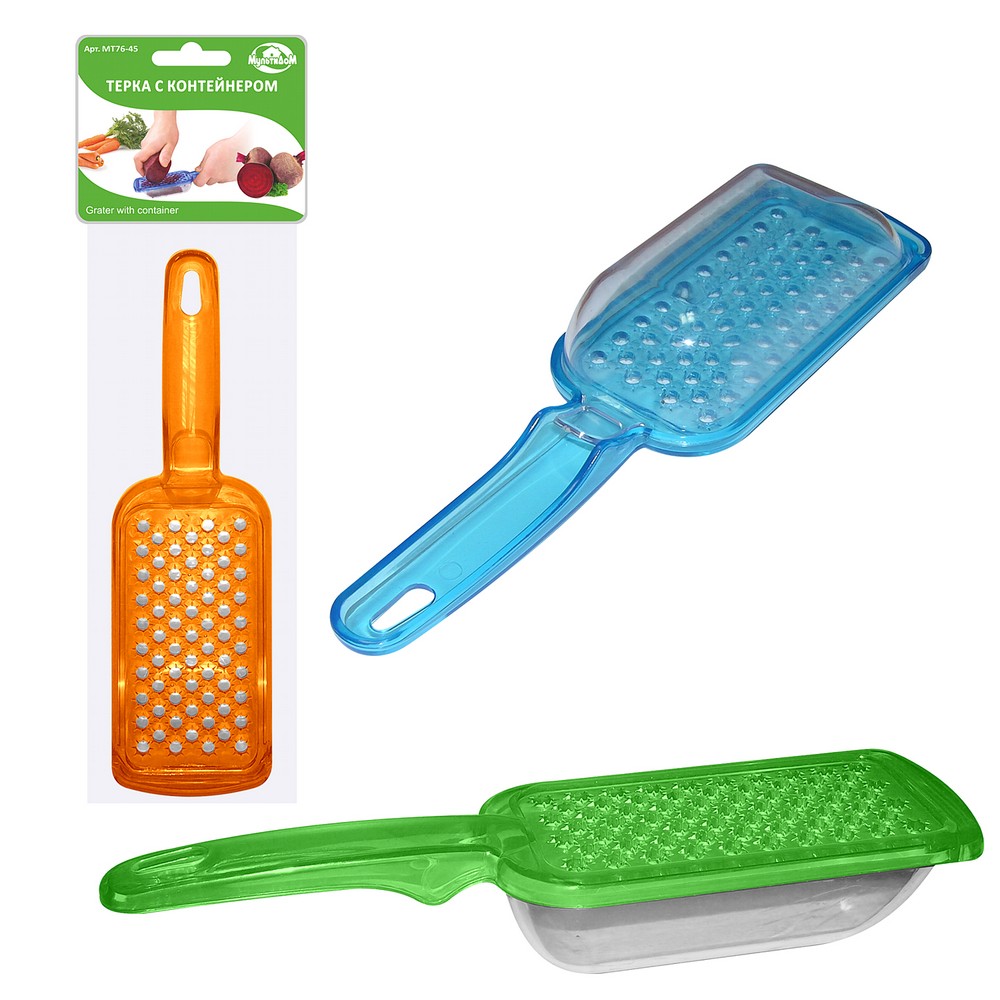 Терка с контейнером поможет быстро и безопасно измельчить фрукты, овощи, сыр, шоколад и другие продукты. Пластиковые зубцы, расположенные на рабочей части безопасны и не теряют со временем остроту. К терке крепится контейнер, который собирает в одном месте все измельченные кусочки. Приспособление удобно не только для кухни, так как позволяет поддерживать порядок, но и для поездок, пикников. Чтобы воспользоваться изделием, присоедините контейнер, подготовьте продукты и натрите их. Для удобства использования предусмотрена специальная ручка. Терка изготовлена из пластмассы (полистирола), после использования промойте изделие в проточной воде, удалив из отверстий остатки пищи.