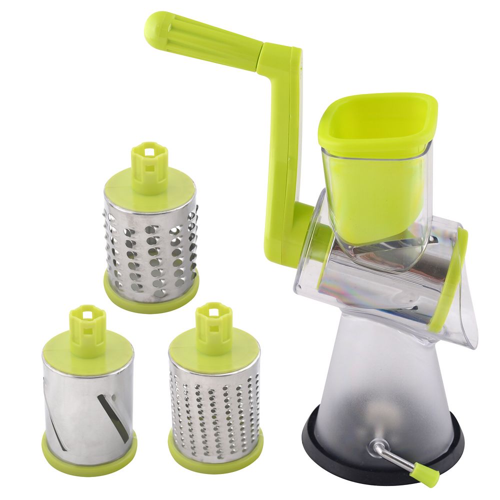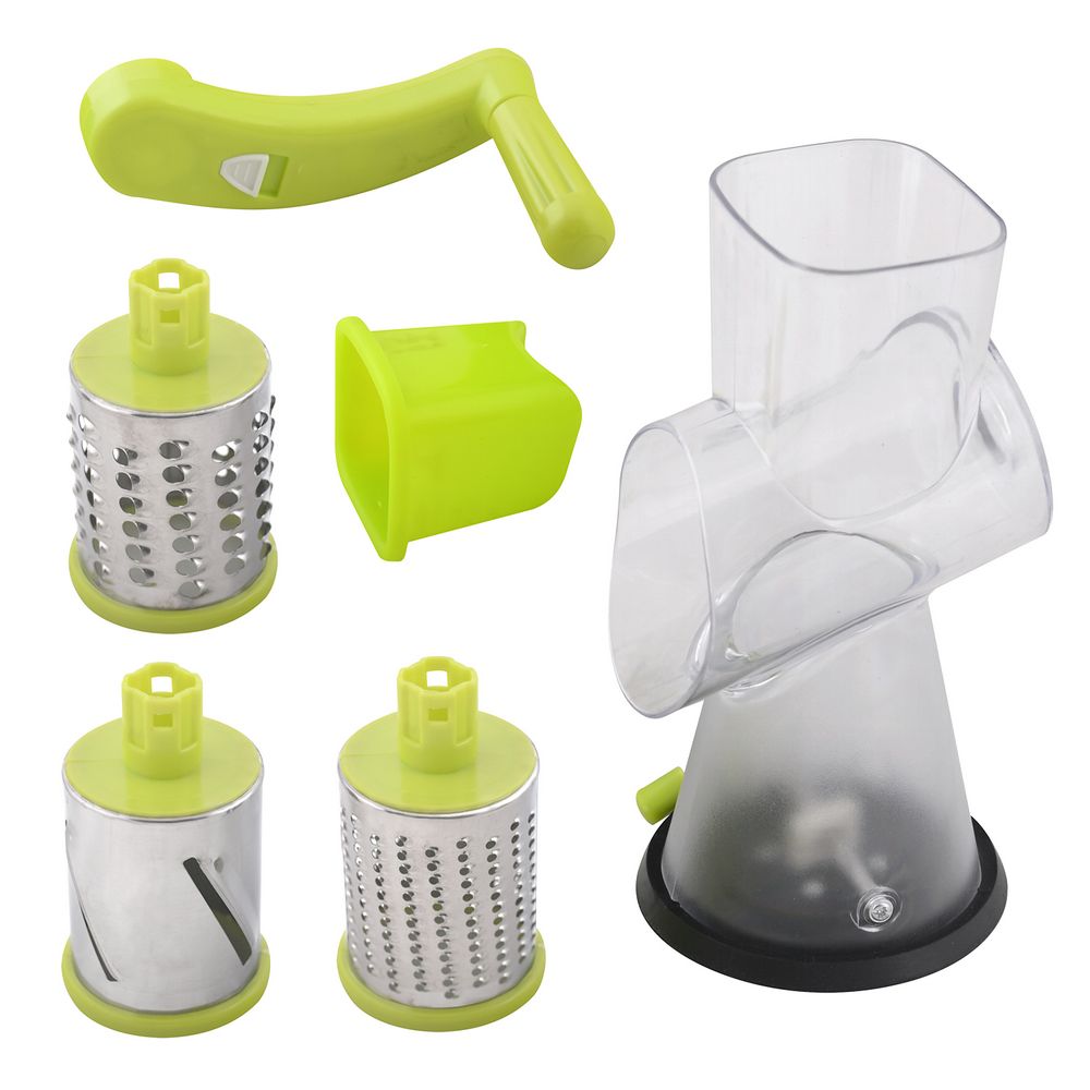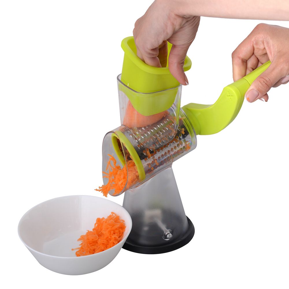 Многофункциональная терка роторная - поможет вручную измельчить продукты до нужного состояния. В комплекте 3 типа насадок: • мелкая — для сыра, приготовления шоколадной крошки, панировочных сухарей; • крупная — для нарезки соломкой; • шинковка — нарезает ломтями картофель, морковь, яблоки и другие продукты. Прибор используется для измельчения овощей, фруктов, орехов и сыра, терка незаменима во время приготовления супов, вторых блюд, салатов и кондитерских изделий. Терка роторная благодаря ручному приводу работает практически бесшумно, в отличие от аналогичных электроприборов.