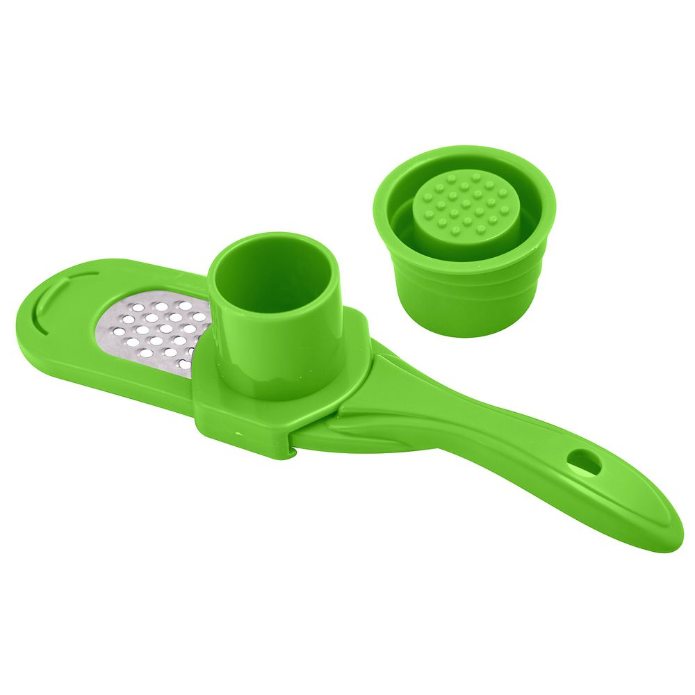 Удобная миниатюрная терка для чеснока поможет вам в приготовлении множества блюд. Этот инструмент также можно использовать для измельчения имбиря, мускатного ореха и других мелких продуктов. Терка для чеснока состоит из трех частей: плоской мини-терки; контейнера, скользящего вдоль рабочей поверхности; держателя-толкателя. Толкатель позволяет удерживать продукт под пластиковым колпаком-предохранителем, не допуская контакта рук с режущими элементами. После использования промойте изделие щеткой под проточной водой, можно с использованием жидких моющих средств. Изготовлено из коррозионностойкой (нержавеющей) стали и пластмассы (PP).