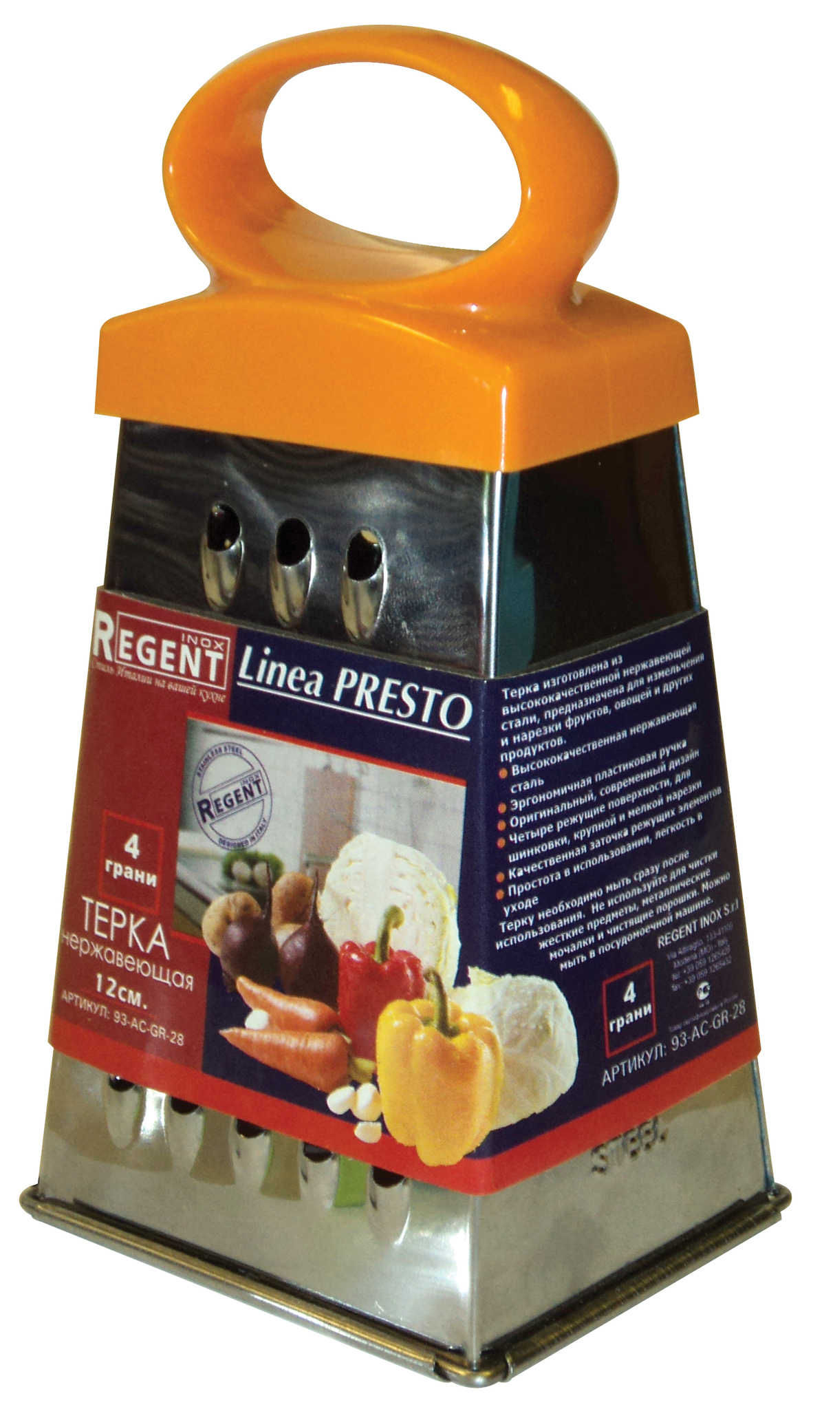 Размер: 12 см Материал: Нержавеющая сталь Вне зависимости от сезона за окном терка Regent Inox Presto охотно выручит Вас в приготовлении или украшении Ваших блюд. Изделие 93-AC-GR-28 выполнено из высококачественной нержавеющей стали. Оно является безопасным для здоровья, экологичным и долговечной в использовании. Тёрка прекрасно моется в посудомоечной машине. Исключительно острые и особо прочные лезвия долго держат заточку. Изделие не окисляется от воздействия продуктов, оставляя их натуральный вкус. Удобная ручка намного облегчает натирание продукта и экономит время.