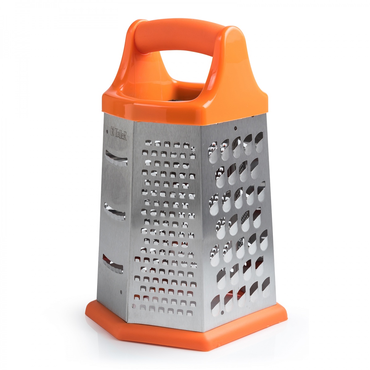 Терка 6 в 1, размеры 13*11,5*21. Терка изготовлена из высококачественной нержавеющей стали: прочна и устойчива к деформации; обладает высокими антикоррозийными свойствами; устойчива к воздействию кислот и щелочей; не изменяет вкусовые качества, запах и цвет пищи, т.к. не вступает в реакцию с ее компонентами. Нескользящие силиконовые протекторы на основании: предотвращают скольжение даже на влажной поверхности; защищают рабочую поверхность от царапин. Легкий наклон рабочей поверхности обеспечивает дополнительную устойчивость в процессе эксплуатации. Специальная усиленная конструкция каркаса предохраняет терку от деформации. Удобная форма ручки обеспечивает надежную фиксацию в руке, не выскальзывает даже при намокании. Особо острые лезвия: долго не притупляются; позволяют быстро и легко измельчить даже такие твердые продукты как шоколад, орехи и т. д. Пригодна для мытья в посудомоечной машине. ОСТОРОЖНО: острые лезвия! Для сохранения превосходного внешнего вида посуды TalleR рекомендуется использовать специальные моющие средства для посуды из нержавеющей стали. Никогда не используйте для чистки посуды TalleR абразивные моющие средства и металлические мочалки. При мытье в посудомоечной машине рекомендуем вынуть посуду сразу после завершения процесса мытья, чтобы исключить возможность появления на посуде пятен конденсатной влаги.