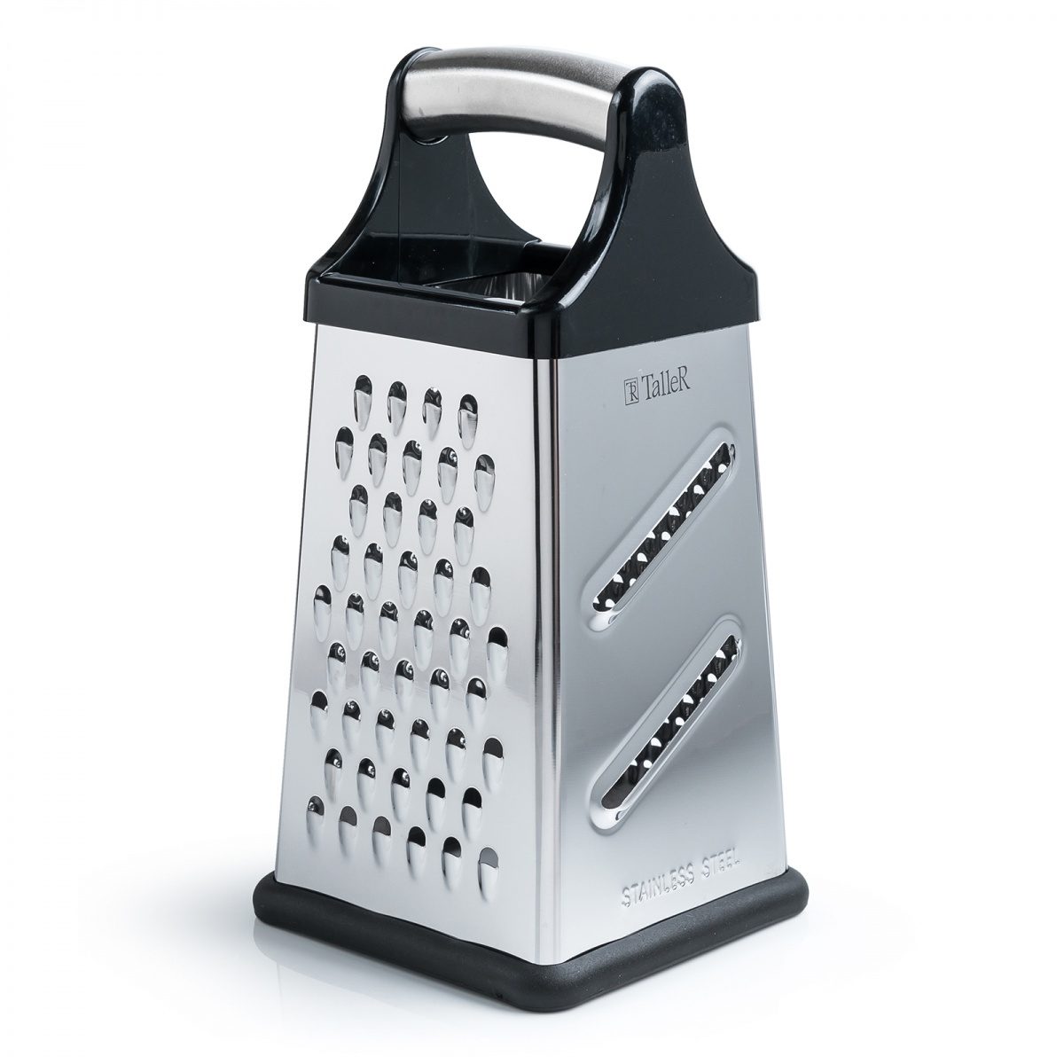 Терка 4 в 1, размеры 10,5*10,5*20,5. Ручка удобной формы не выскальзывает из рук даже при намокании. Нескользящий силиконовый протектор на основании предотвращает скольжение во время использования и защищает поверхность от повреждений.