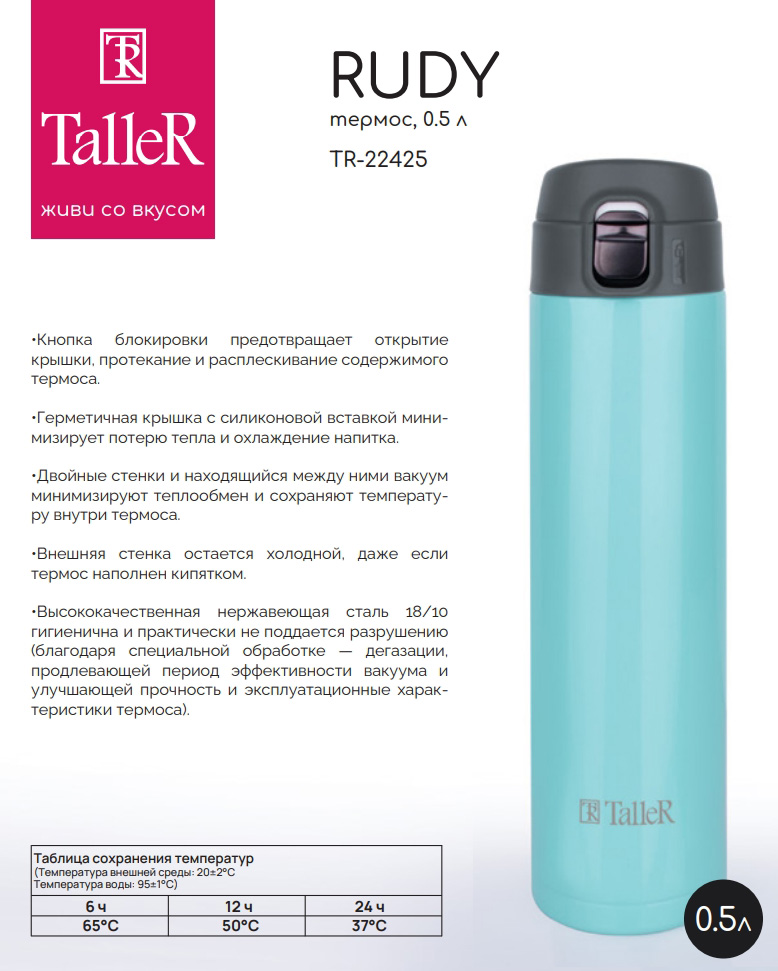 Колба термоса изготовлена из высококачественной нержавеющей стали марки 18/10 (AISI 304).